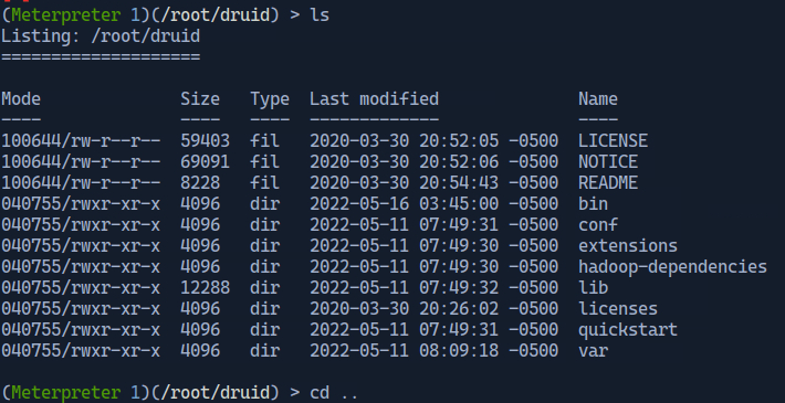 After the exploit has been successfully executed we are remotely logged into the root/druid directory.